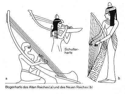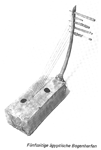 Die Harfe tritt zum ersten Mal im alten Aegypten in Form der Bogenharfe (2850 - 2160 v.Chr.) auf, 6-8saitig, auf dem Boden stehend.