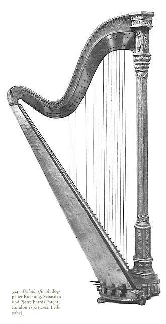 Um 1810 erfinden Sebastian und Pierre Erard die vollchromatische Doppelpedalharfe, die sich allgemeinen durchsetzt und als Vorgängerin der modernen Konzertharfe gilt.