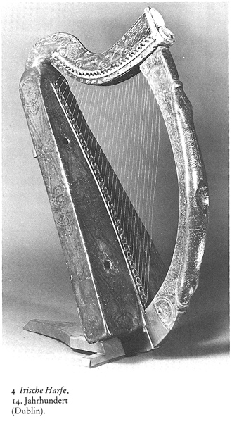 In Europa tritt die Harfe zuerst im 8. Jhdt. in Irland auf, als Rahmenharfe mit Vorderstange zwischen Korpus und Saitenhalter.